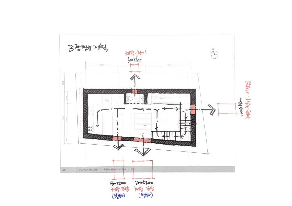 주거 밀집지역 내 위치한 이번 주택의 특성상, 도로에 접한 동측면을 제외하고 북,서,남측에는 건물이 인접한 상태입니다. 채광과 조망을 확보하기 위해서 (이웃한 건물과 간섭 없는 생활권 보장을 위해서는) 계획시, 높이가 확보되는 3층 구간에 정주공간(거실,주방,식당)을 배치 합니다. 그리고 남측으로 열리는 대형창호를 계획, 건물의 채광과 조망을 확보합니다. 2층 동측에 웰컴공간에는 도로와 관계 맺는 코너창을 설치, 건물의 정면성과 외부의 관계를 설정합니다.