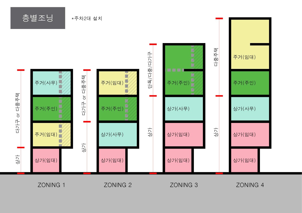 1. 조닝4에서 2층 상가(임대)를 삭제하여, 적정규모(비용)를 목표로 진행