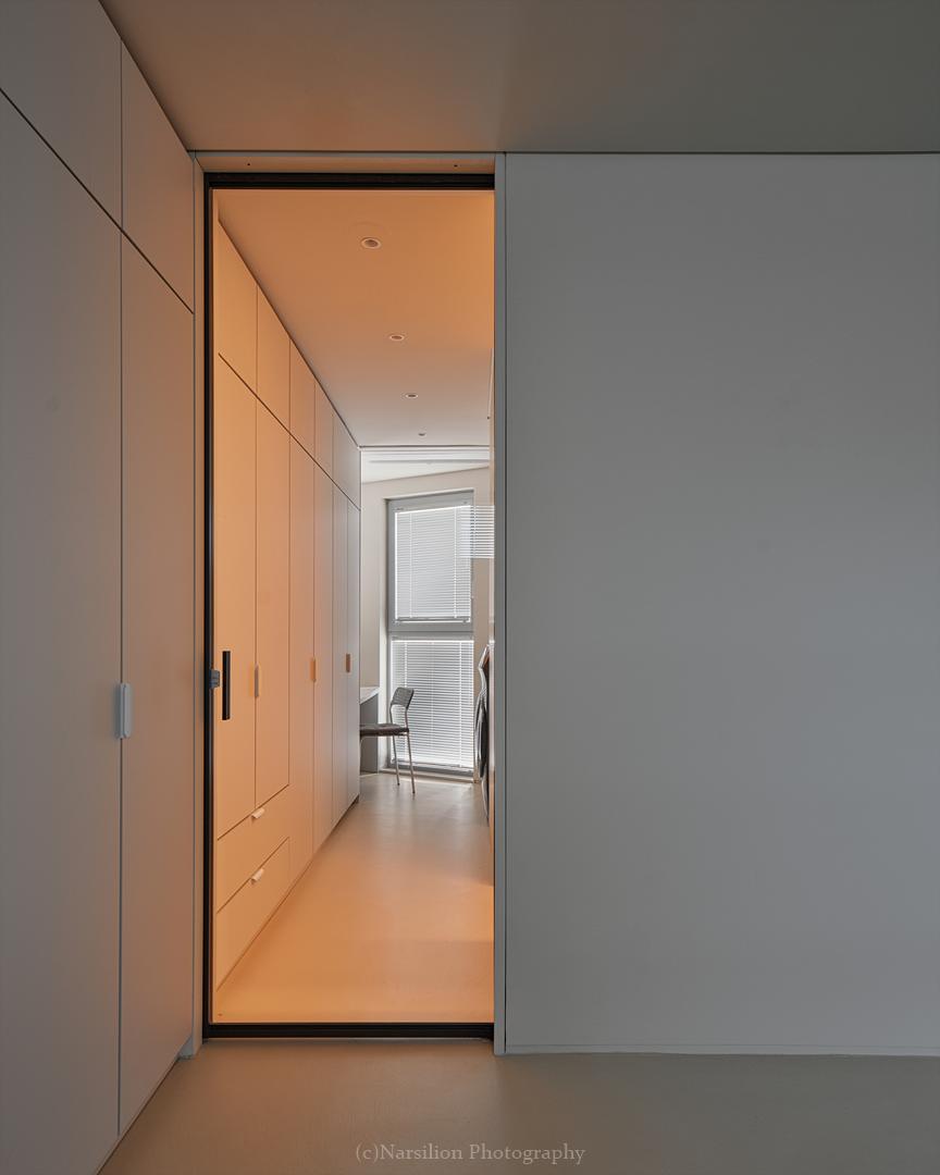 각 공간에는 거주자의 필요에 맞춰 맞춤형 수납공간이 설계된다. 3층 붙박이장은 침실과 욕실을 연결하는 동선 역할과 드레스룸 역할을 동시에 수행한다. 동선의 끝에는 세탁실을 배치해 효율성을 높였고, 북측 모서리 매립욕조로 이어지는 분기점에는 파우더 겸 세면대를 설치해 유기적인 생활 동선을 만들었다. 2층 사선 벽체를 따라 설치된 주방 가구는 주방용품을 넉넉하게 수납할 수 있도록 하고, 북측 모서리의 팬트리로 실용성을 높였다. 여기에 1층 아뜰리에 수납장에 설치된 히든도어는 화장실을 재치 있게 감추는 매력을 보여준다.