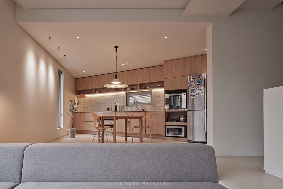 ▶함께하는 여유 공간: 거실과 주방의 조화로운 배치
