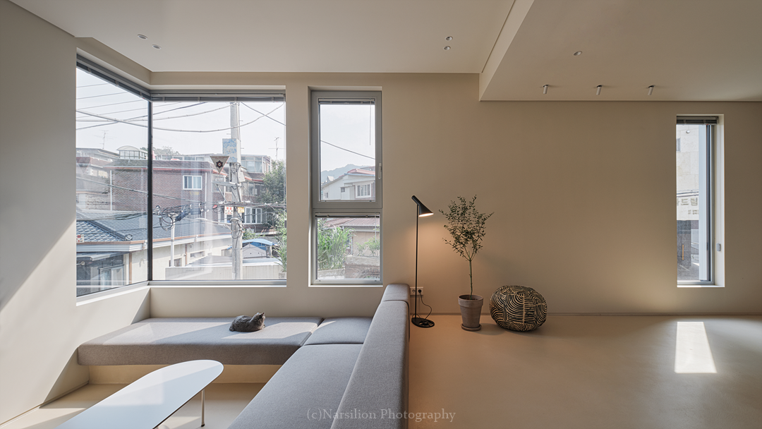 The skylights and clerestory windows strategically block intrusive views while inviting abundant natural light. Meanwhile, the corner window, thoughtfully placed at the intersection of two streets, allows for a gentle exchange with the tranquil surroundings. Together, these elements redefine urban privacy and connection, creating a sanctuary in the midst of Suyu-dong’s bustling core.
