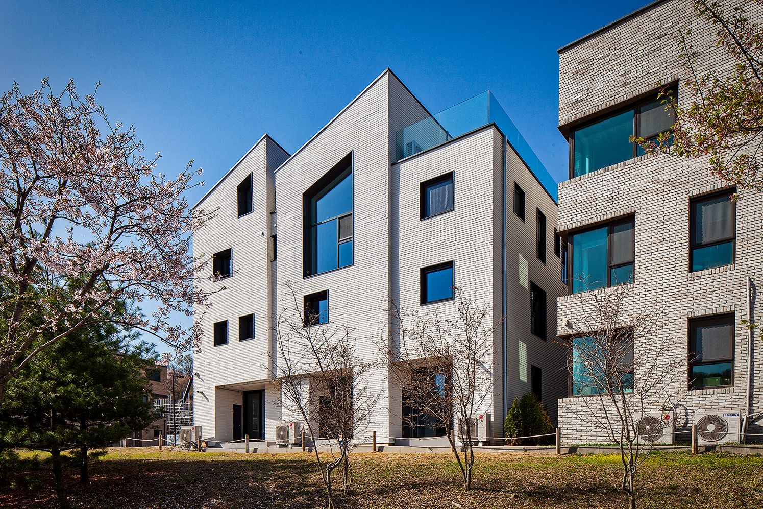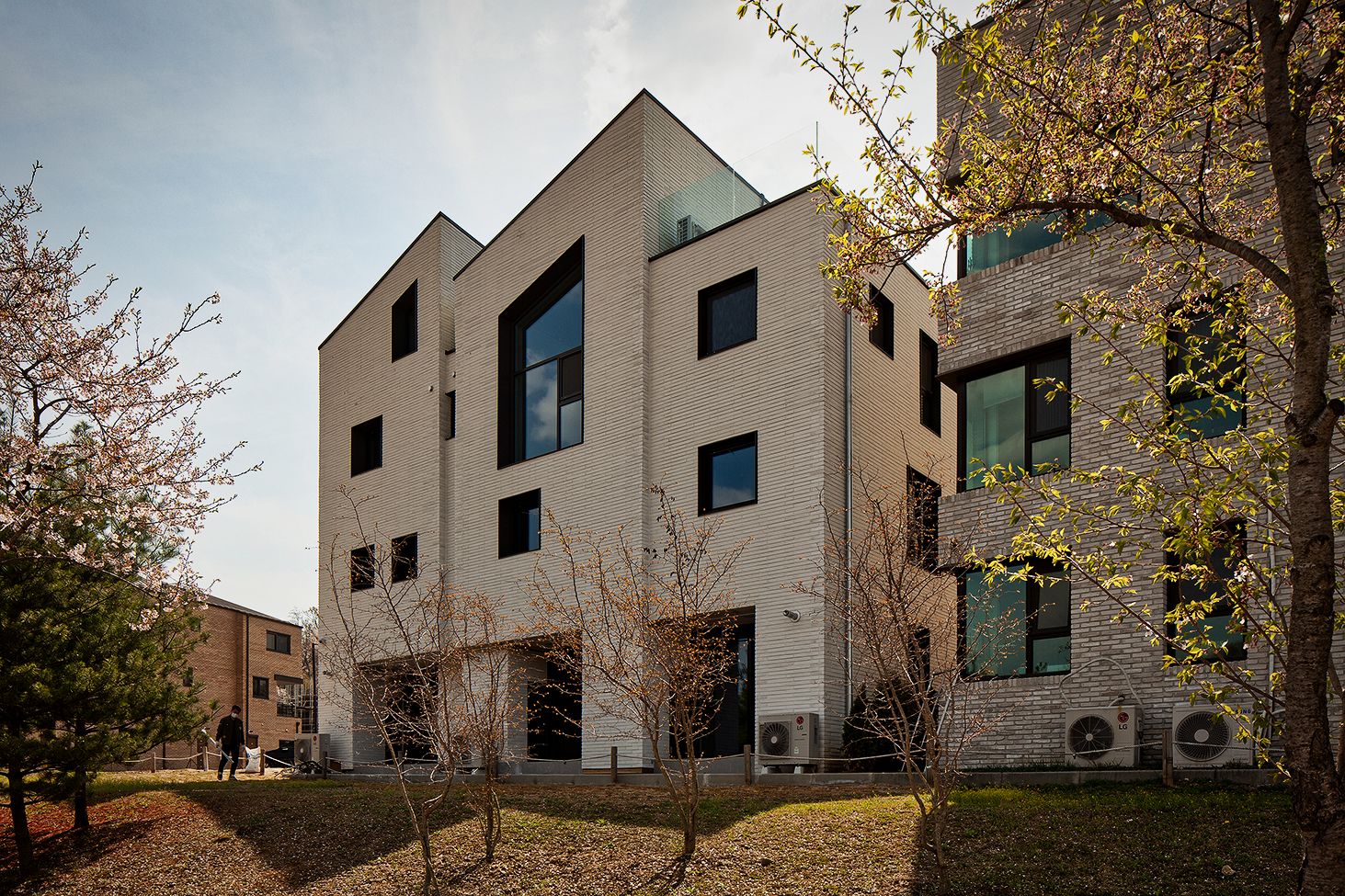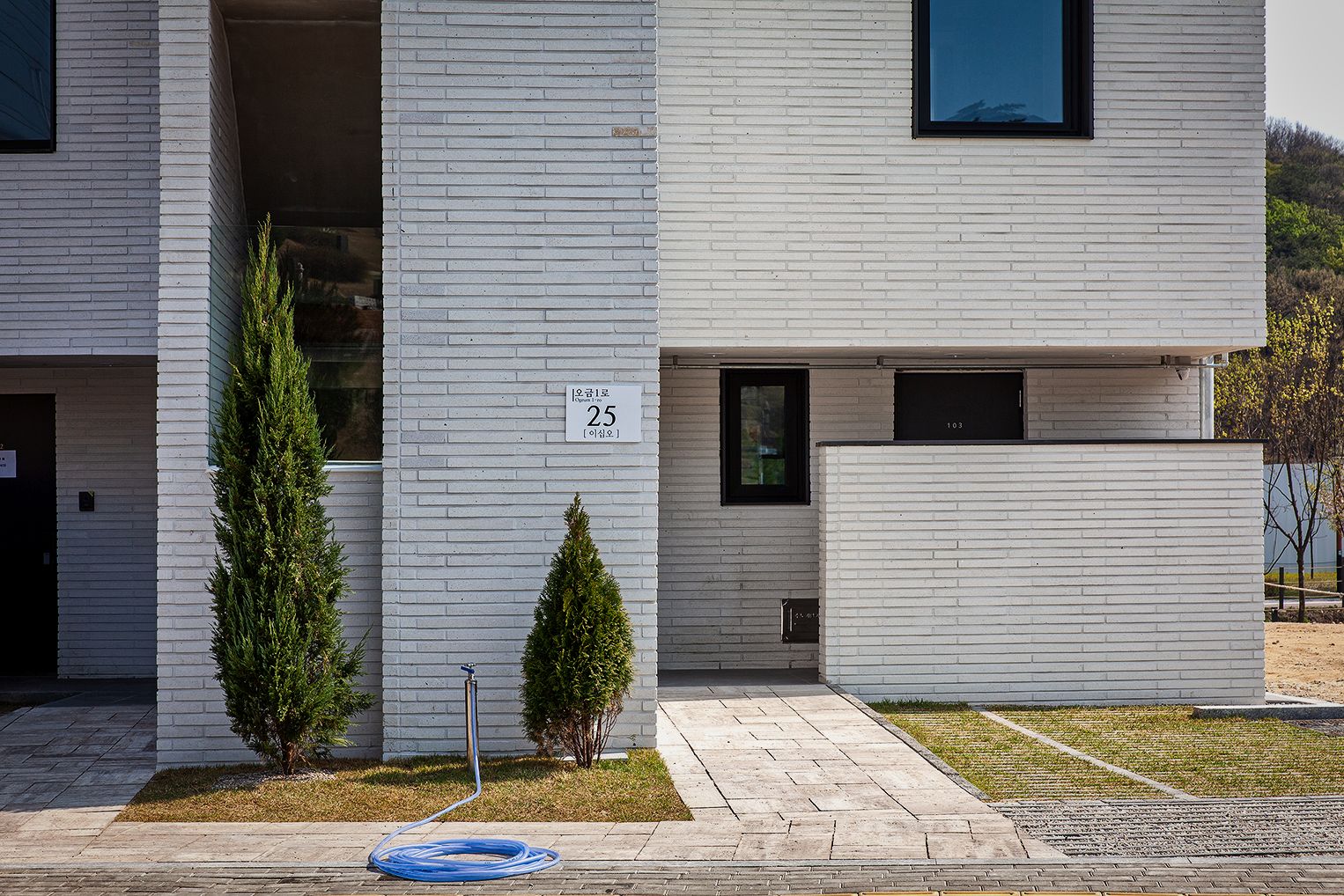 설계기법 및 디자인 의도에 따라 세로방향으로 집을 읽도록 유도하고, 외장재를 가로배치하여 텍스쳐(texture:질감)를 느낄 수 있도록 합니다. 질감의 단계를 하나씩 밟고 올라가면서 켜를 느끼게 하고 싶었습니다. 동시에 질감을 갖는 거대한 덩어리(mass)처럼 보이길 바랬습니다. 이를 위해 질감의 켜가 방향성을 갖지 않도록 백색벽돌의 컬러와 유사한 백색줄눈을 적용합니다. 재료가 방향성을 갖게 되면, 재료에 초첨이 맞추어져서 전체를 방해하기 때문이죠.