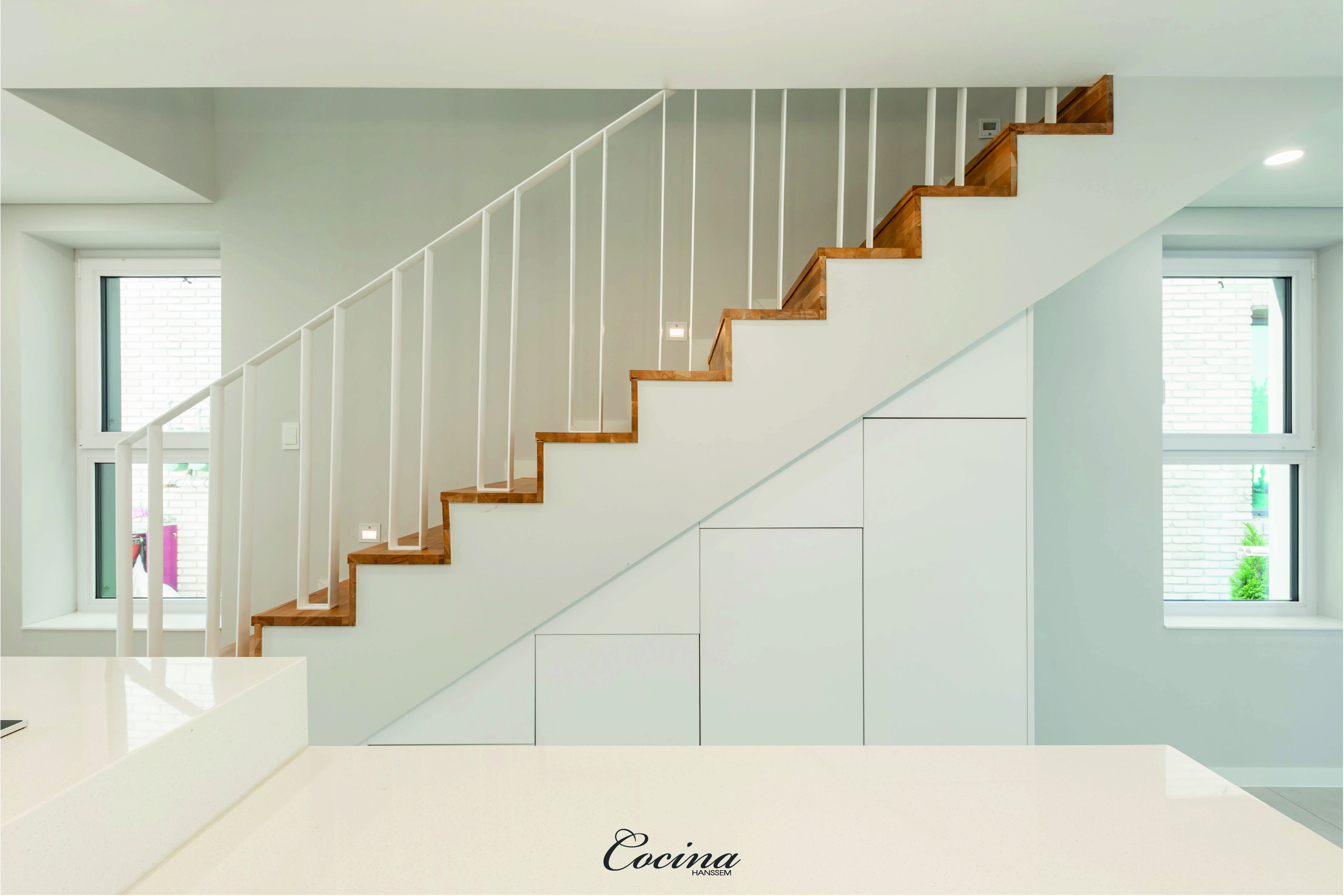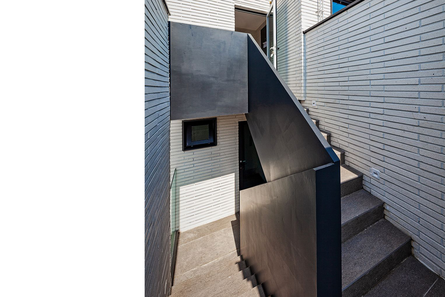 외부계단실은 세로로 긴 보이드가 적용됩니다. 수직동선의 시야확보와 건축적 비례로 나누어진 집의 세로를 강조하는 디자인 어휘입니다.