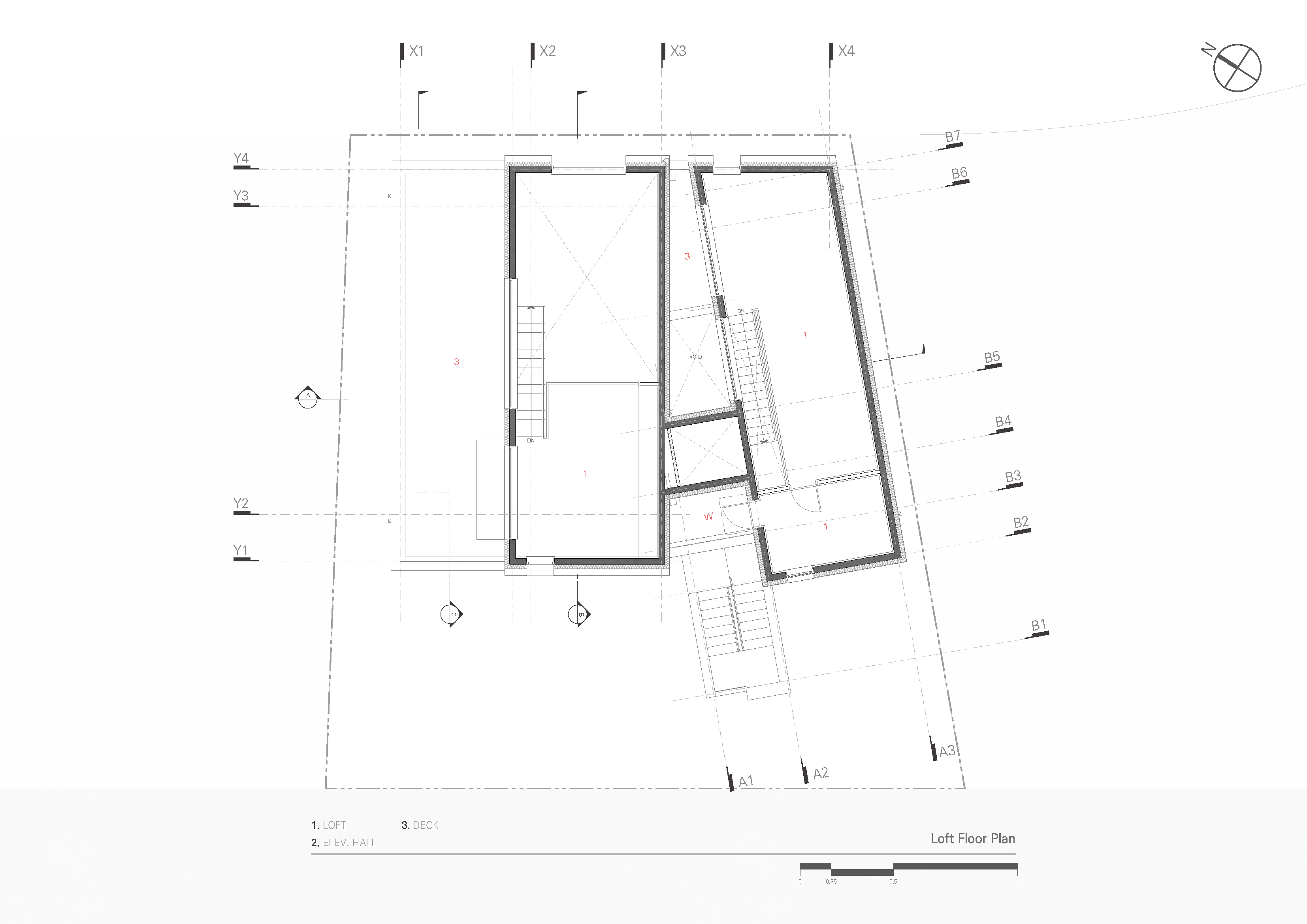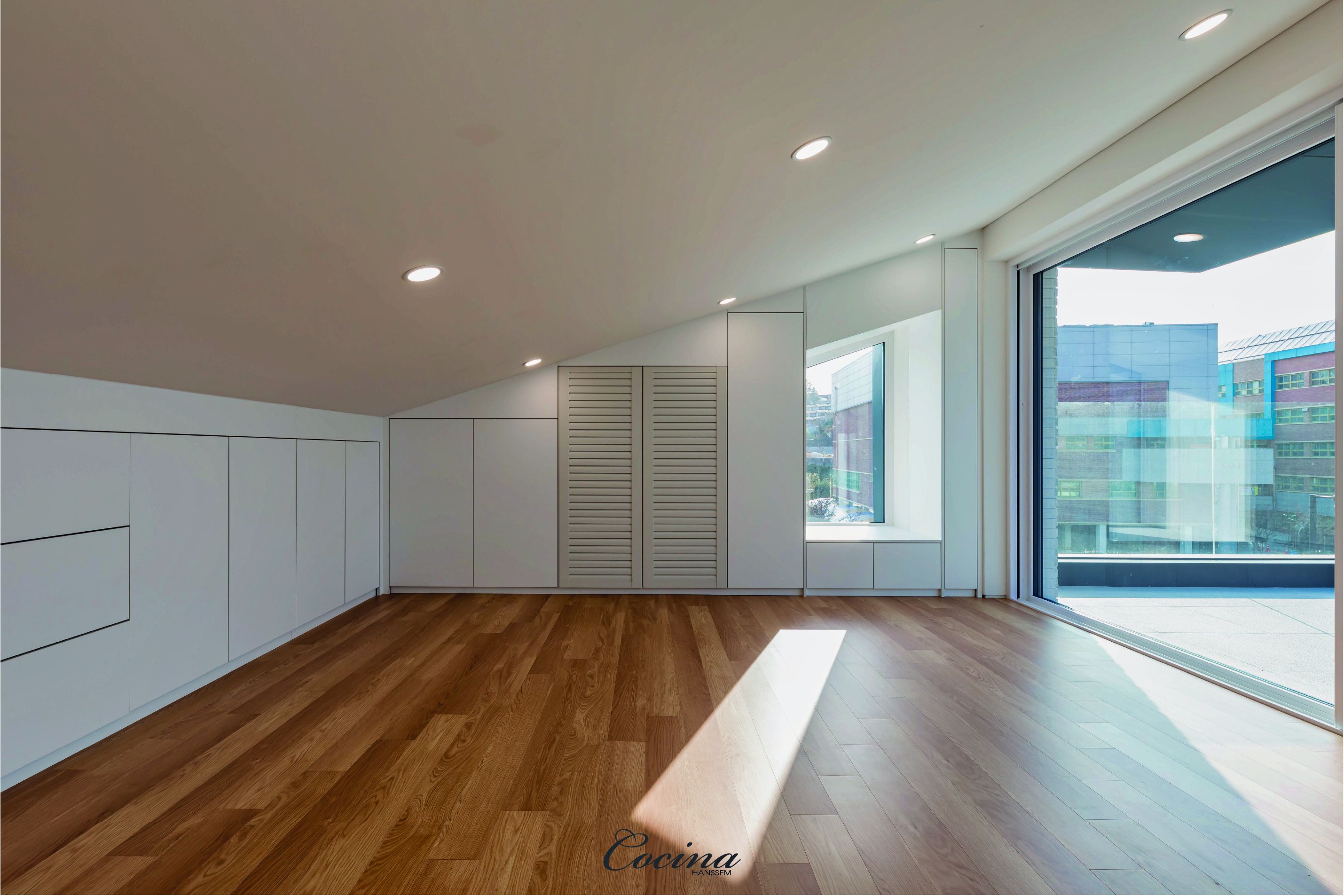 실내에서 옥상데크로 확장되는 공간을 설계하기 위해서는 다락이 필요합니다. (실내)높이제약이 있는 다락에서 사선지붕은 선택이 아니라 필수라고 생각합니다. 범용적인 실(RM)의 사용보다는 완충공간, 수납공간, 알파공간으로 정의되는 다락의 특성상 옥상데크와 실내를 연결하는 소통공간으로 적용합니다.