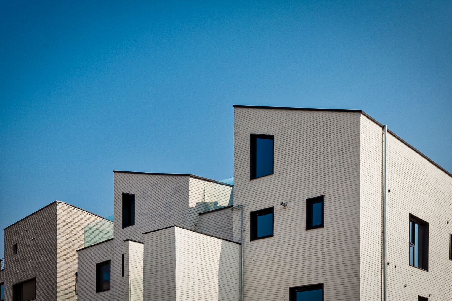 정면 도로에서 바라볼때, 3개의 집이 붙어 있는 모습입니다. 왼쪽부터 차례대로 직사각형 집과 두개의 사다리꼴형 집이 보입니다. 두개의 사다리꼴 집 사이에는 외부로 돌출된 작은 계단실이 있습니다. 계단실을 기준으로 두개의 사다리꼴 집은 10도 벌어져 있어요. 보는 시점에 따라 집의 정면이 다르게 보이는 이유이기도 합니다.