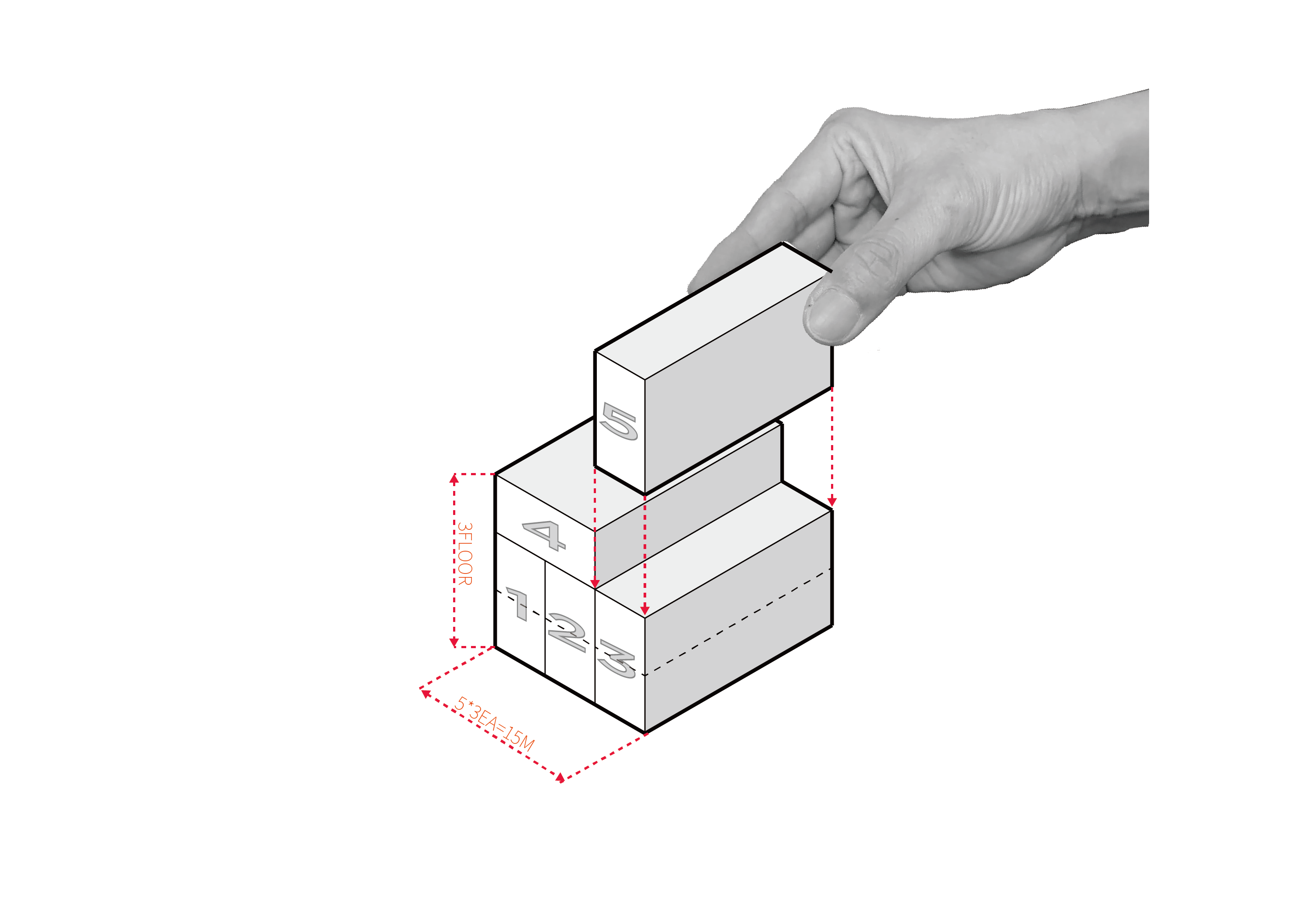 대지의 최소폭, 16m를 기준으로 3개의 임대가구를 복층(1층~2층) 로우하우스 타입으로 대지형상을 따라 배치합니다. 정면과 후면폭 차이에서 오는 쇄기형태의 보이드에 건물의 숨구멍: 중정과 상층부 주거를 위한 코어(core: 계단, 엘리베이터)를 배치합니다. 2개의 가구는 3층에 배치합니다. 2개의 모듈을 사용하는 주인가구와 1개의 모듈을 사용하는 임대가구가 중정을 기점으로 배치됩니다.