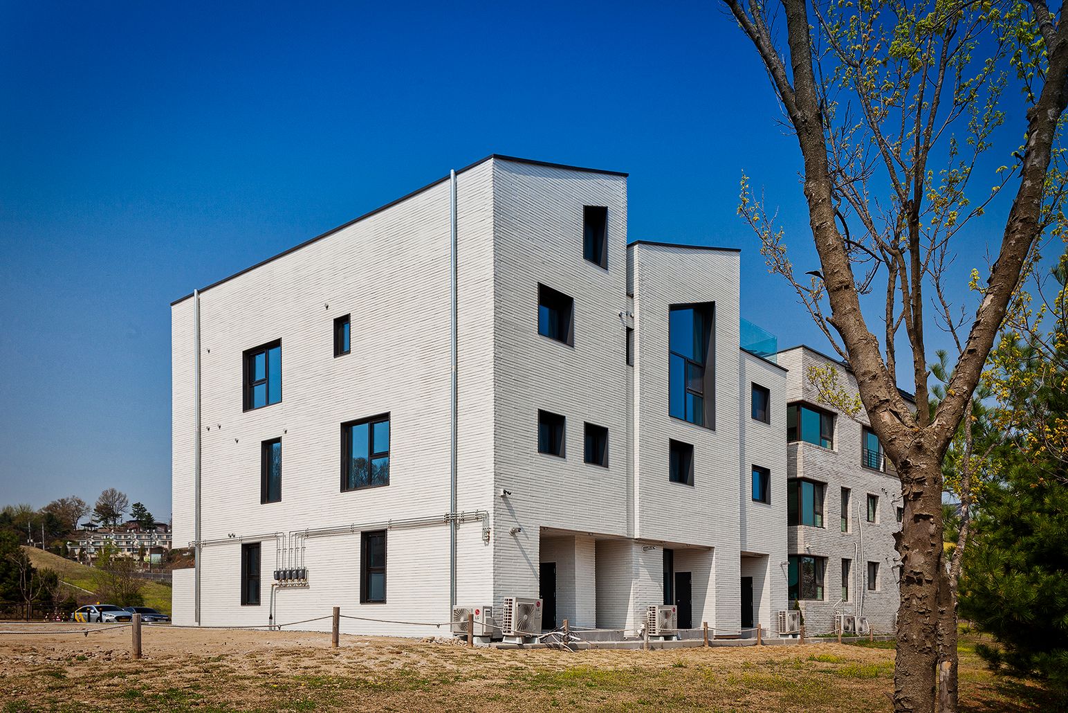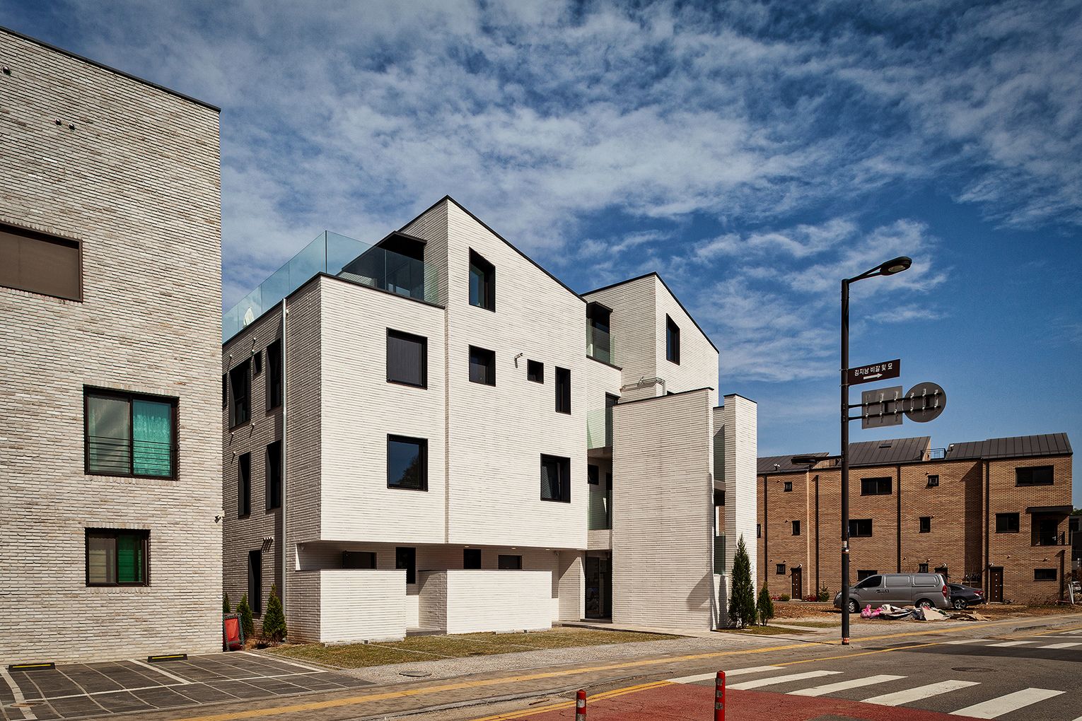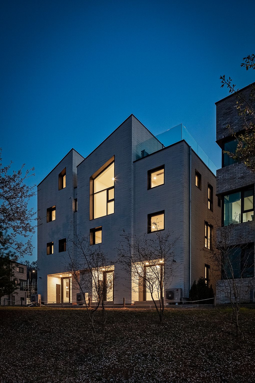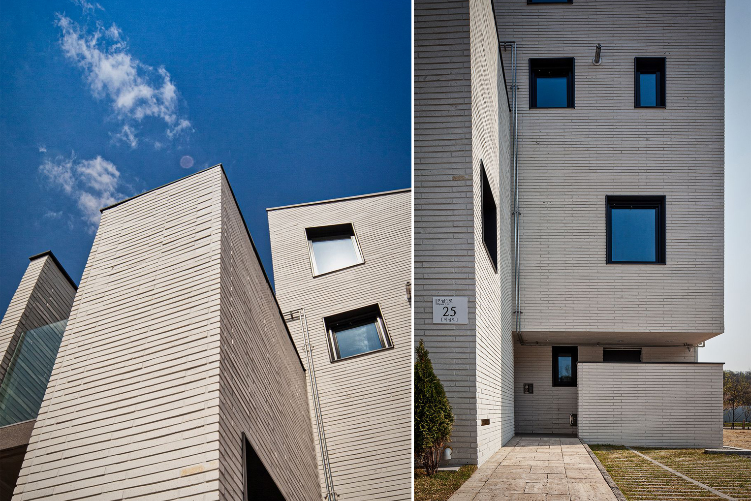 설계기법 및 디자인 의도에 따라 세로방향으로 집을 읽도록 유도하고, 외장재를 가로배치하여 텍스쳐(texture:질감)를 느낄 수 있도록 합니다. 질감의 단계를 하나씩 밟고 올라가면서 켜를 느끼게 하고 싶었습니다. 동시에 질감을 갖는 거대한 덩어리(mass)처럼 보이길 바랬습니다. 이를 위해 질감의 켜가 방향성을 갖지 않도록 백색벽돌의 컬러와 유사한 백색줄눈을 적용합니다. 재료가 방향성을 갖게 되면, 재료에 초첨이 맞추어져서 전체를 방해하기 때문이죠.