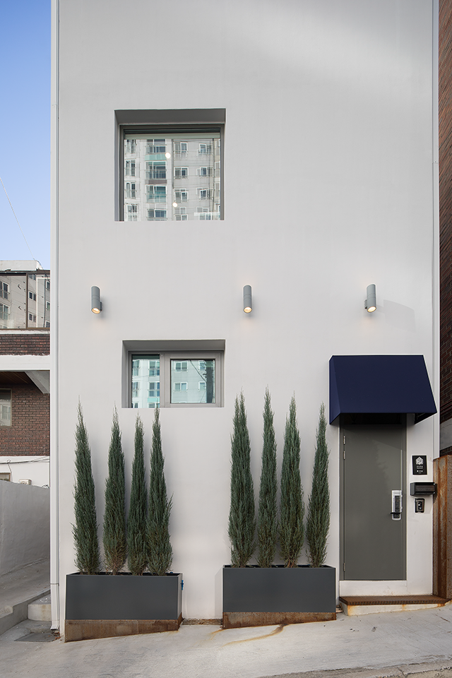 협소한 대지는 내외부를 완충하는 물리적 간극이 좁다. 외부환경이 좋은 경우, 내외부를 밀착시키는 건축어휘가 적용된다. 하지만 반대에 경우, 외부와 가로환경을 고려한 출입구는 일정부분 간극을 이격시켜, 심리적 안정감을 주는게 좋다. 금회 경우처럼 물리적 간극이 적은 경우, 조경공간을 배치하여 이를 상쇄시키도록 한다.