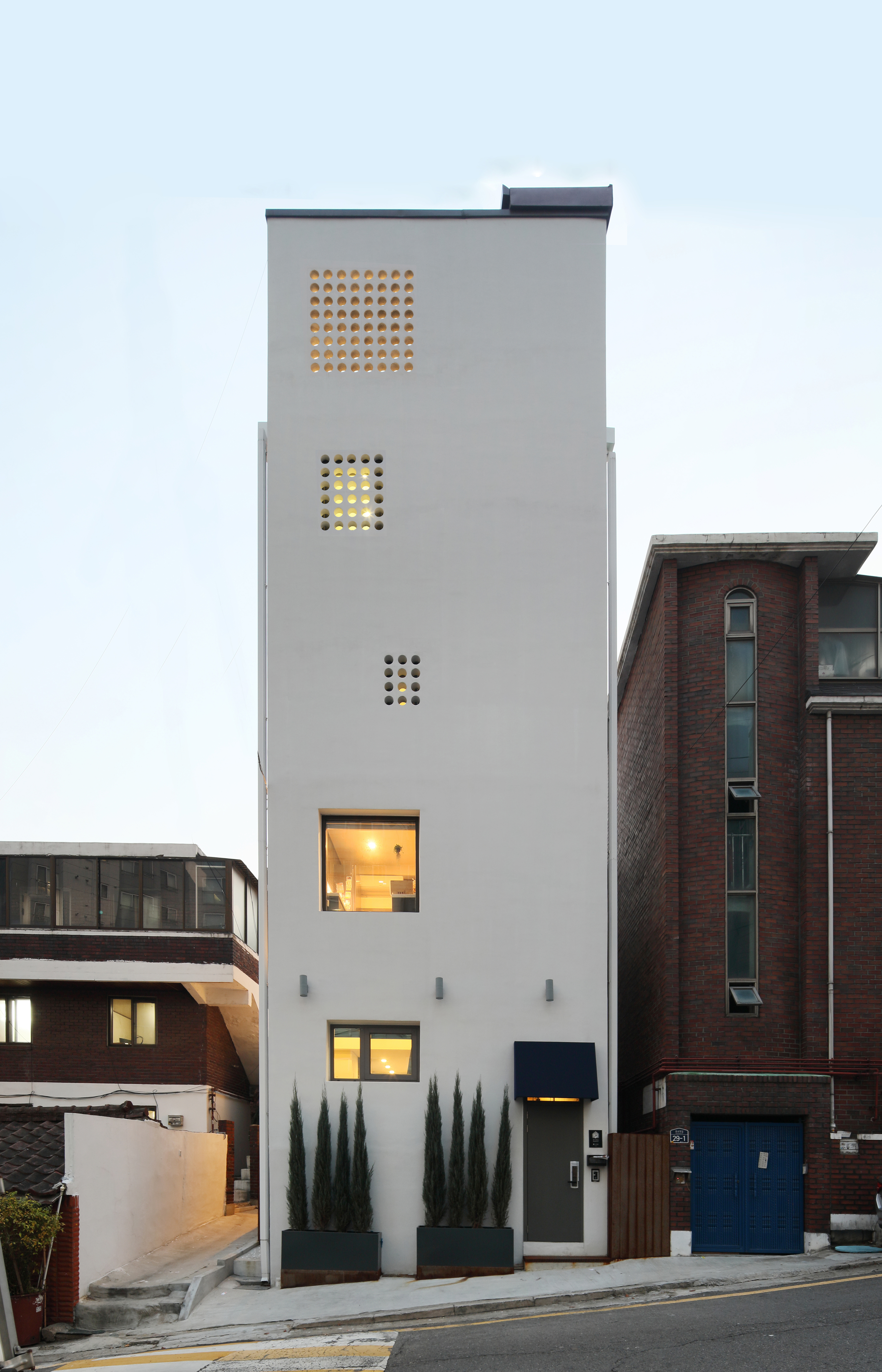 -입면을 타공된 듯한 도트 디자인은 균질한 입면 디자인 구현과 거주자 프라이버시 확보를 위한 건축어휘이다.