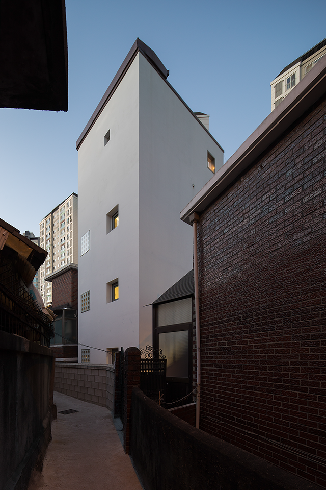 전면과 후면은 각기 다른 도시풍경을 전달한다. (전면 12미터 도로와 후면 2미터 도로는 약 4미터 높이차가 있다.)