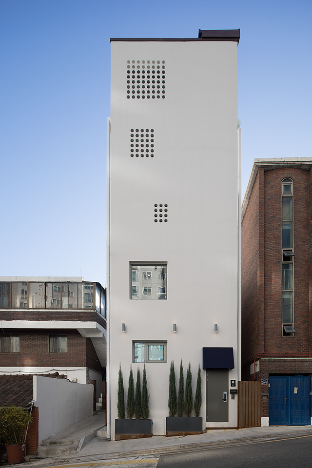 -입면을 타공된 듯한 도트 디자인은 균질한 입면 디자인 구현과 거주자 프라이버시 확보를 위한 건축어휘이다.