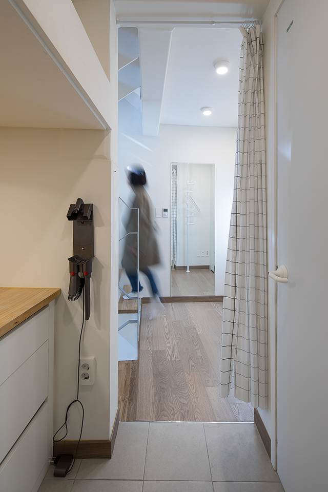 백색공간을 바탕으로 부드러운 질감의 나무 마루재를 사용, 작지만 포근한 분위기를 유도한다.
