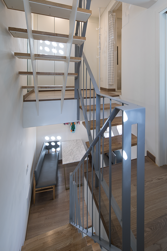 내부공간으로 투영된 열린계단은 층을 연결하는 동선기능과 공간을 확장시키는 역활을 한다. 이 방법은 거주인원 간의 합의 또는 실구획이 완료되어야 가능하다. 4층에 위치한 침실의 관계를 고려, 3층에 위치한 마스터침실은 실로 구획된다. (내부 공간이 수직적으로 모두 연결, 확장하는 전제하에 열린계단은 적용된다.)