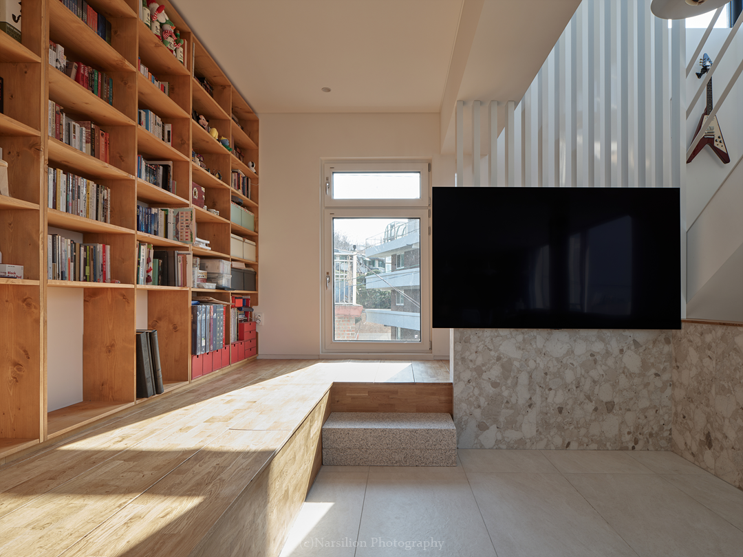 반정주공간을 만든다. 작지만 다양한 활용이 가능하다. 일광욕을 빙자한 멍때리기도 가능하고 잠깐의 핸드폰질도 할 수 있다. 무엇보다 중요한 것은 수직으로 연속된 공간의 피로감을 조금이나마 완화시켜주는 기능을 담는다. 40센티 높이의 스플릿레벨은 벤치와 같은 기능으로 좌식생활에서 일어날 수 있는 생활을 담는다. 책장과 엮어 독서의 기능으로 확대해도 좋다. 무엇보다 줄어든 수직거리만큼 계단이동시 발생하는 피로감을 완화해준다. 사용자에 따라 윈도우시트 또는 리딩누크와 툇마루로 부른다.