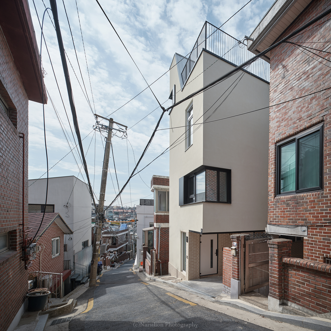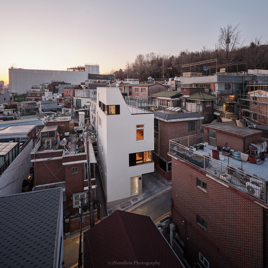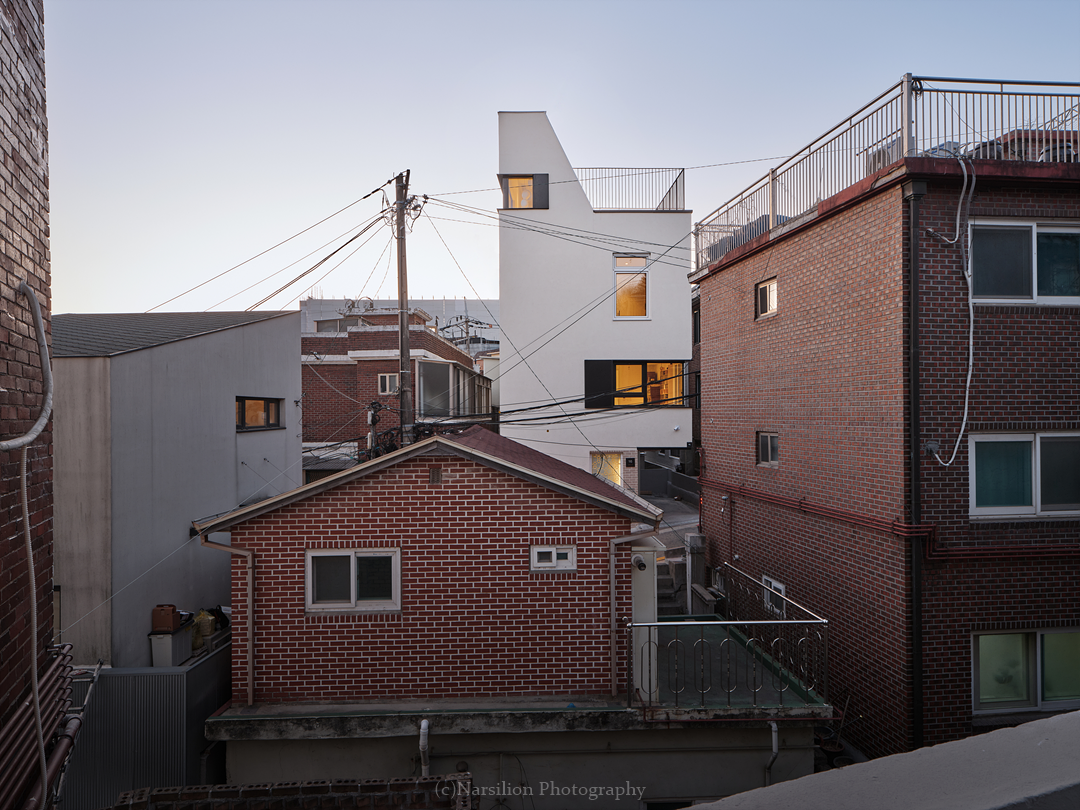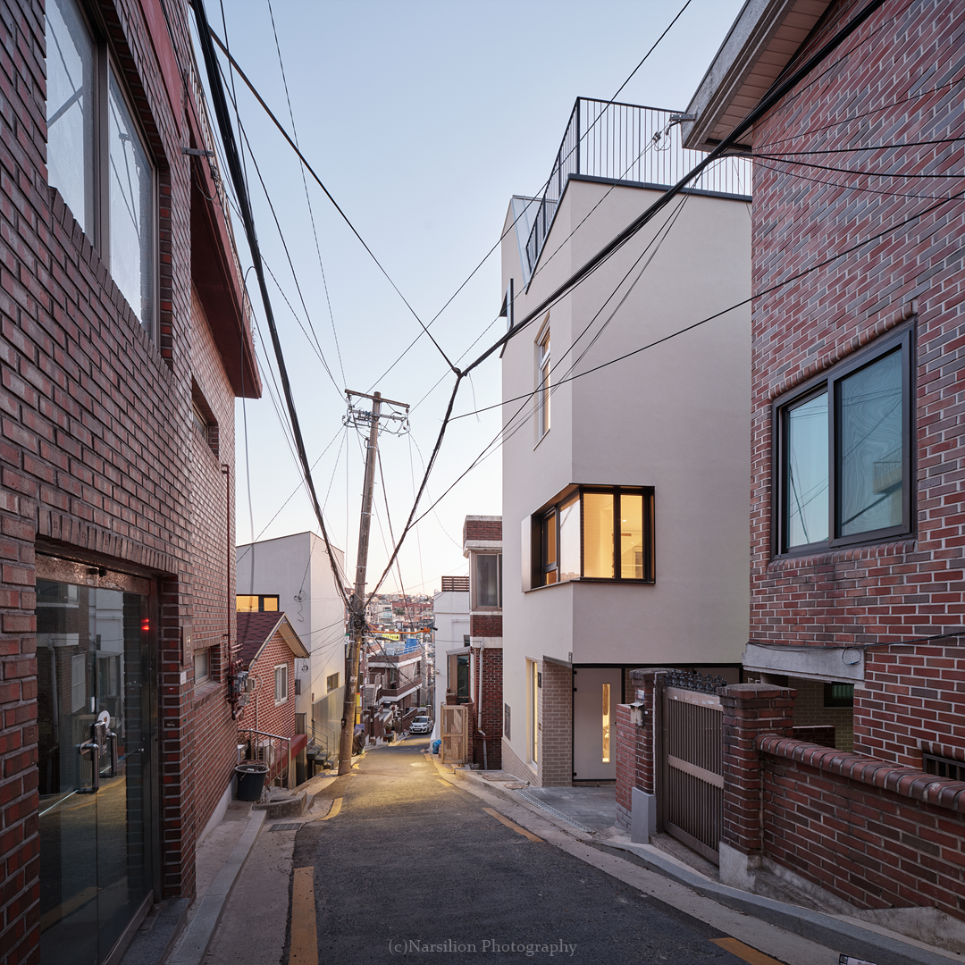 건축주는 몇개의 집과 땅을 보고 지금의 집을 선택했다. 교통이 불편한 것을 감안하고 서울 한복판에 남산; 숲세권을 갖는 장소로 생각한 것이다. 5분거리에 남산산책로에 갈 수 있는 이태원에 속해 있다. 하지만 건축을 하기에 대지의 상황은 호락호락하지 않았다. 대지가 접한 유일한 동측 4미터 도로는 경사가 있는 막힌 도로이다. 건축공간의 불리함은 설계를 통해서 얼마든지 극복할 수 있다. 하지만 시공은 다른 이야기 이다. 4미터 경사도로에 펌프카를 접안하고 레미콘을 좁은 골목길에 후진으로 들어오는 공사현장은 상상하기 힘들었다. 기존 건물 철거 또한 쉽지 않은 상황이다. 대지의 이해는 건축주가 이해하는 대지에서 시작한다. 다행이도 건축주의 이해가 우리만큼 좋았다. 대지를 계약했을때 보지 못했던 점들을 우리를 통해서 새롭게 이해하기 시작했다. 그 호흡 덕분에 지금의 글을 쓴다.