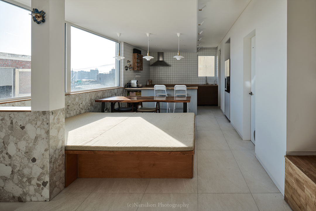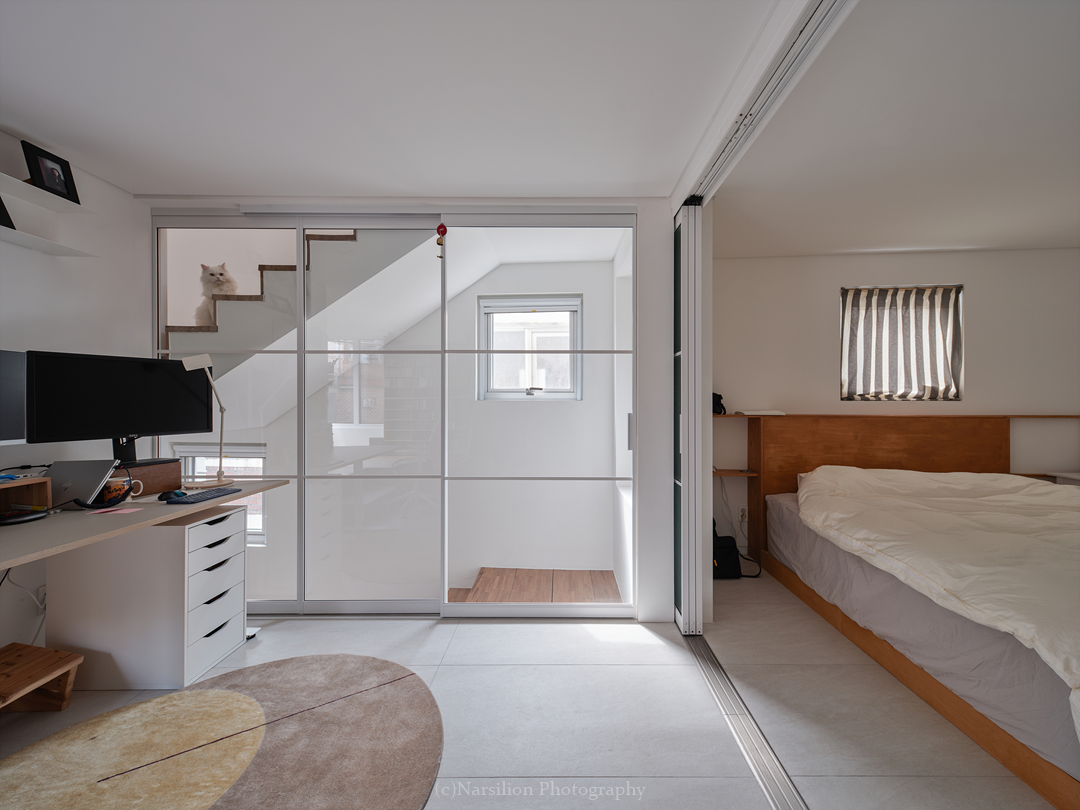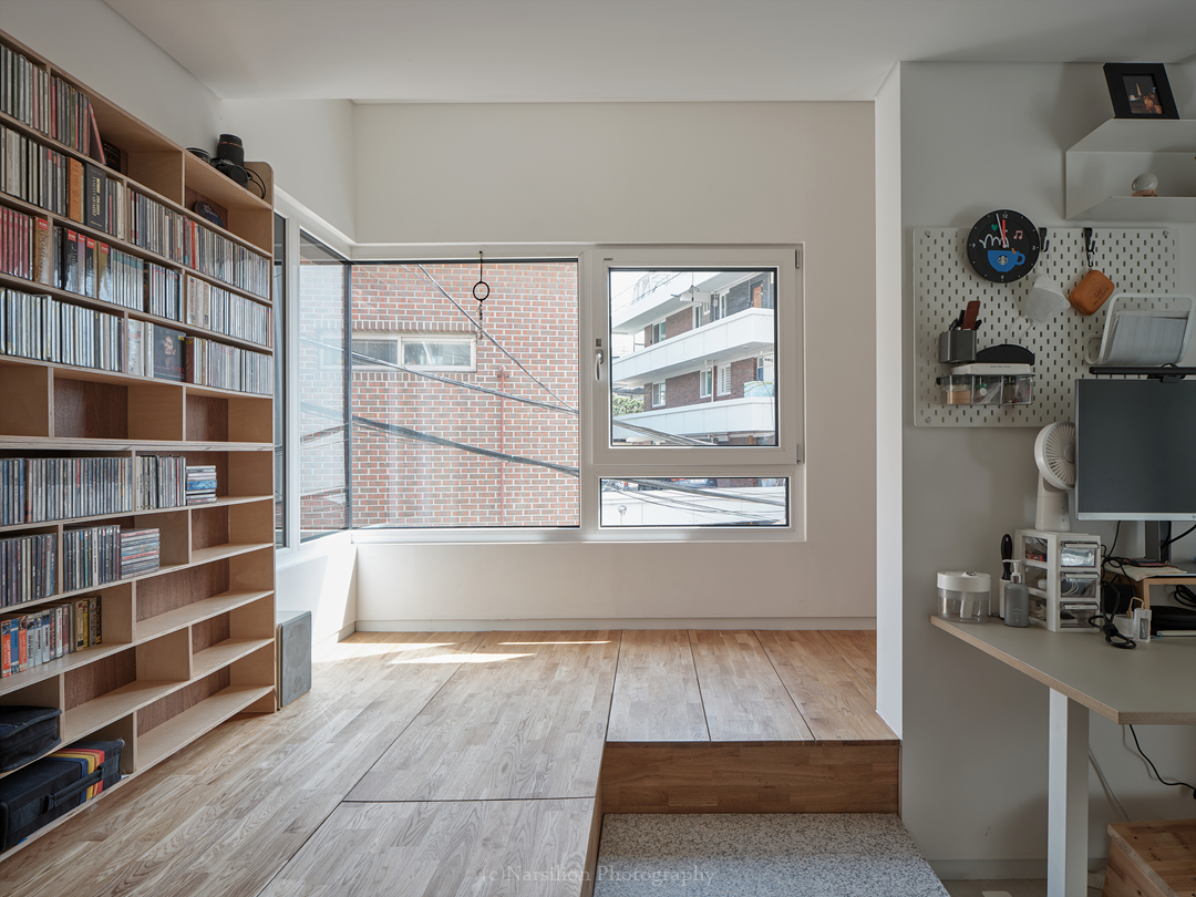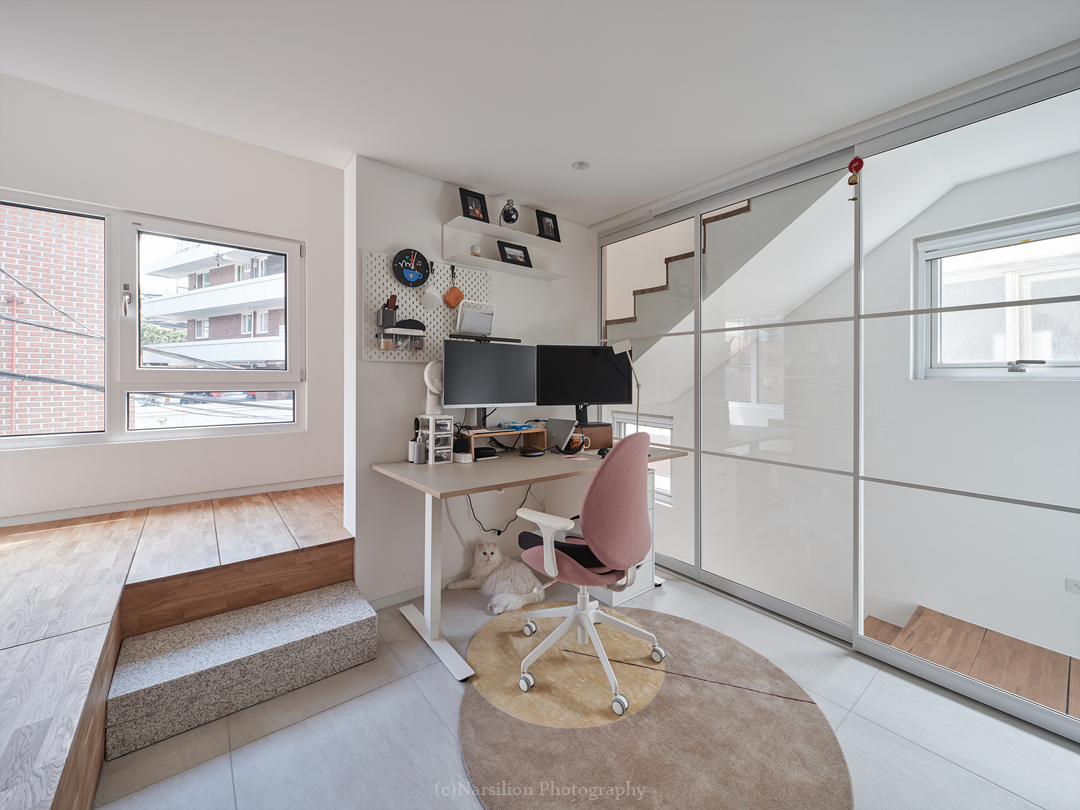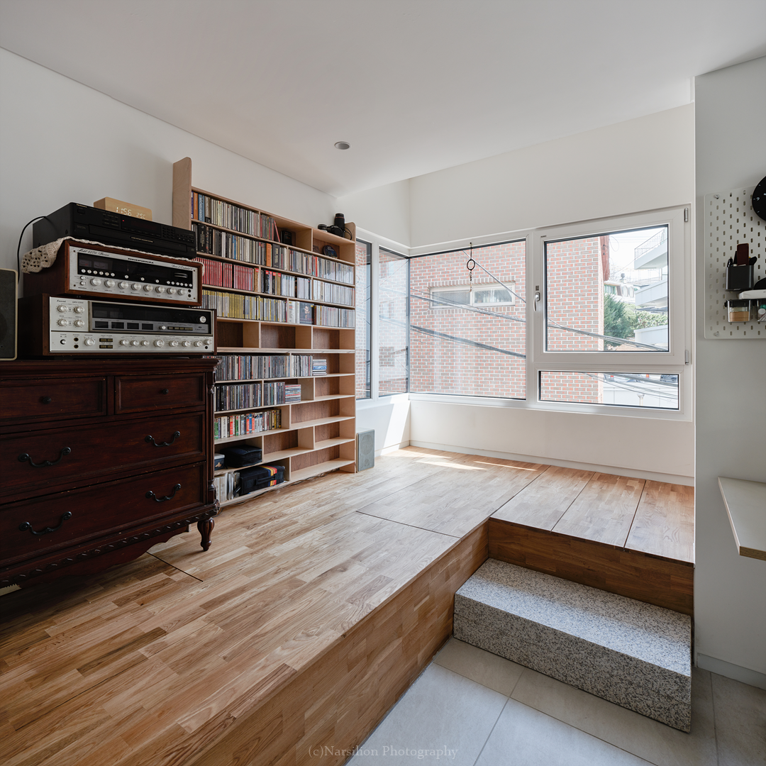 반정주공간을 만든다. 작지만 다양한 활용이 가능하다. 일광욕을 빙자한 멍때리기도 가능하고 잠깐의 핸드폰질도 할 수 있다. 무엇보다 중요한 것은 수직으로 연속된 공간의 피로감을 조금이나마 완화시켜주는 기능을 담는다. 40센티 높이의 스플릿레벨은 벤치와 같은 기능으로 좌식생활에서 일어날 수 있는 생활을 담는다. 책장과 엮어 독서의 기능으로 확대해도 좋다. 무엇보다 줄어든 수직거리만큼 계단이동시 발생하는 피로감을 완화해준다. 사용자에 따라 윈도우시트 또는 리딩누크와 툇마루로 부른다.