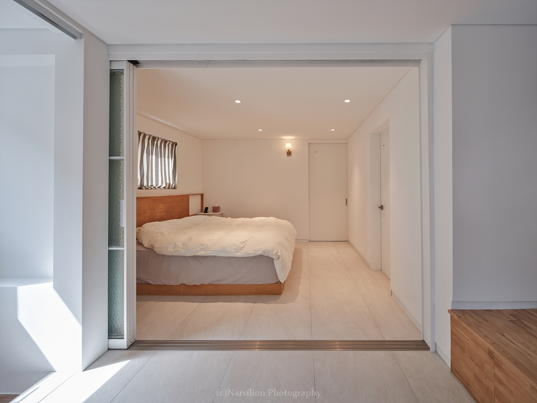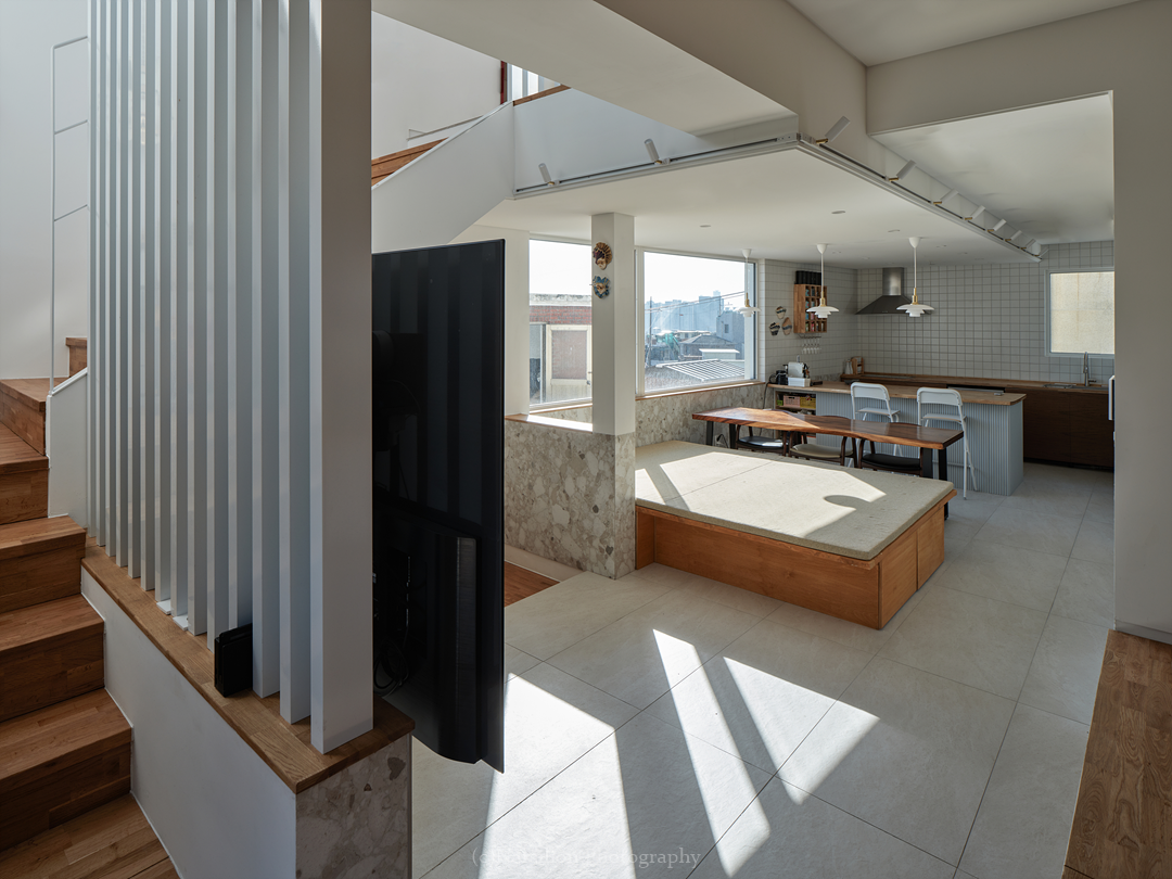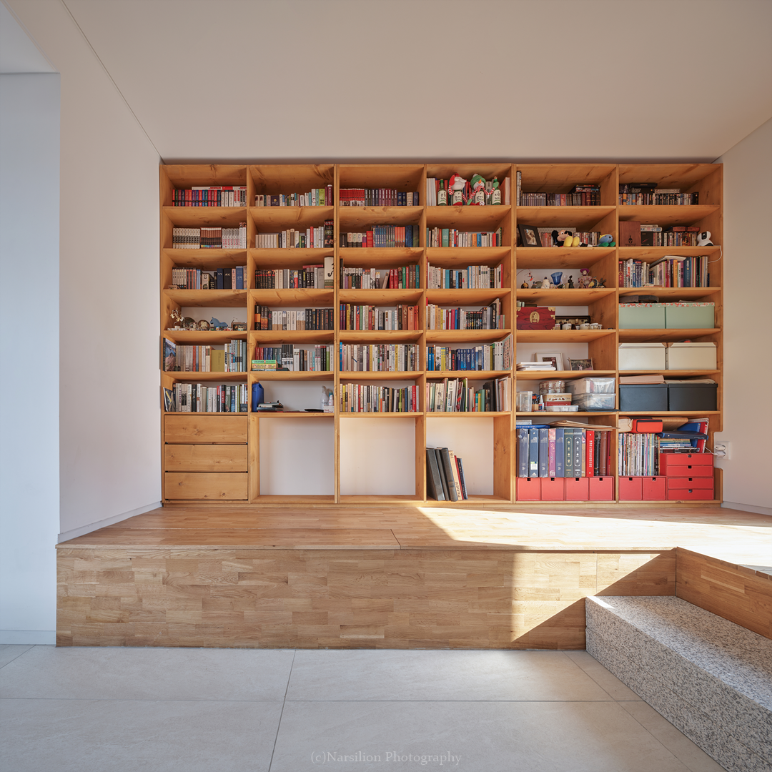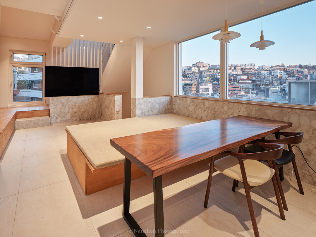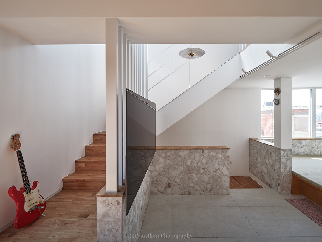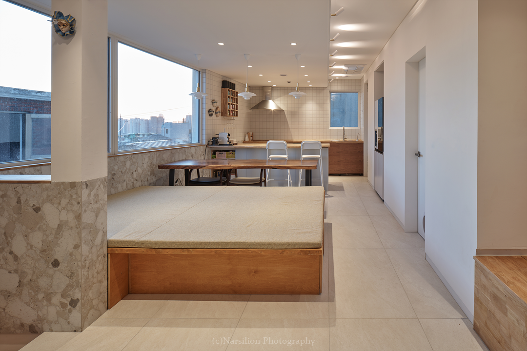 반정주공간을 만든다. 작지만 다양한 활용이 가능하다. 일광욕을 빙자한 멍때리기도 가능하고 잠깐의 핸드폰질도 할 수 있다. 무엇보다 중요한 것은 수직으로 연속된 공간의 피로감을 조금이나마 완화시켜주는 기능을 담는다. 40센티 높이의 스플릿레벨은 벤치와 같은 기능으로 좌식생활에서 일어날 수 있는 생활을 담는다. 책장과 엮어 독서의 기능으로 확대해도 좋다. 무엇보다 줄어든 수직거리만큼 계단이동시 발생하는 피로감을 완화해준다. 사용자에 따라 윈도우시트 또는 리딩누크와 툇마루로 부른다.