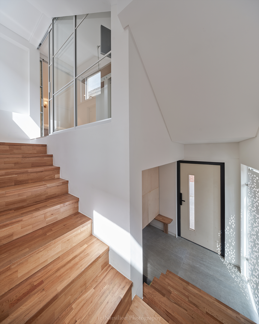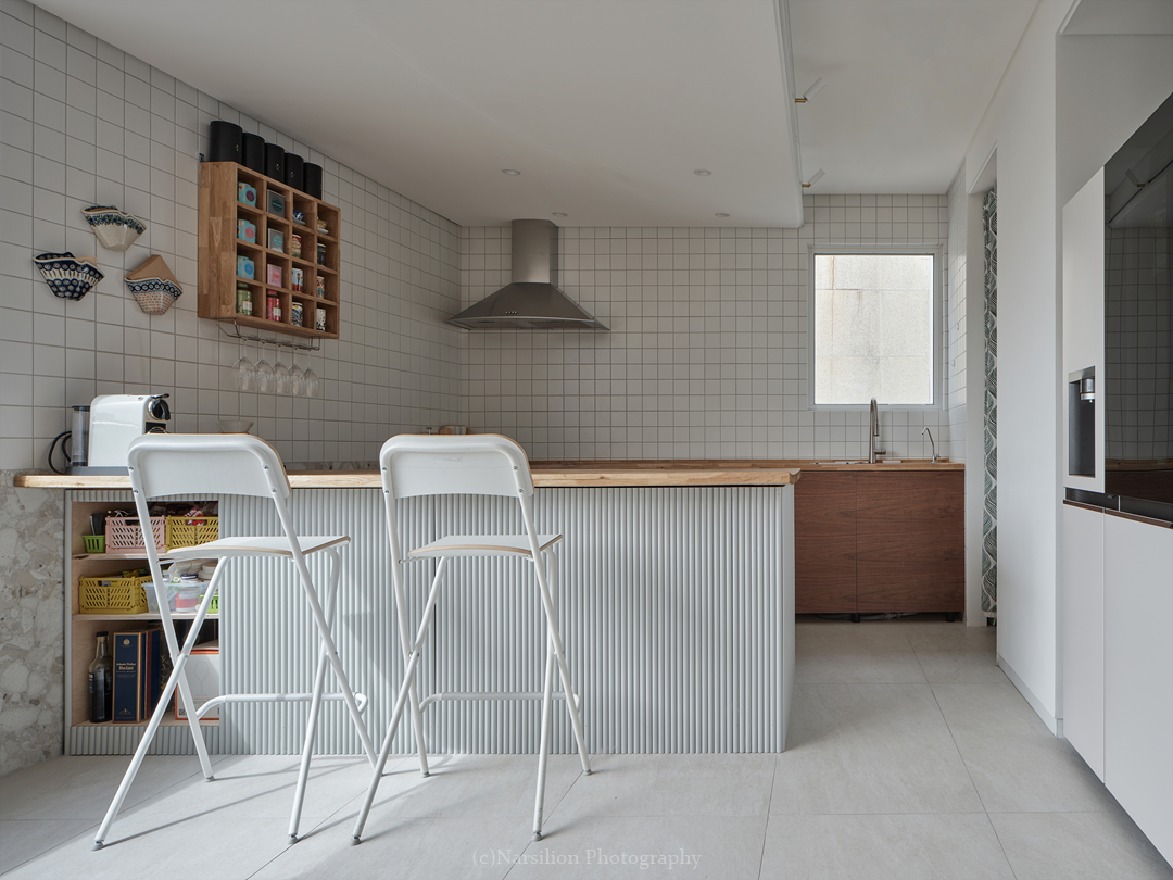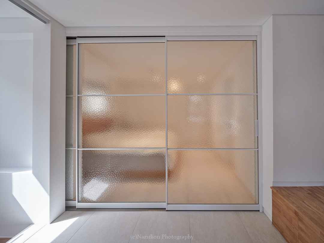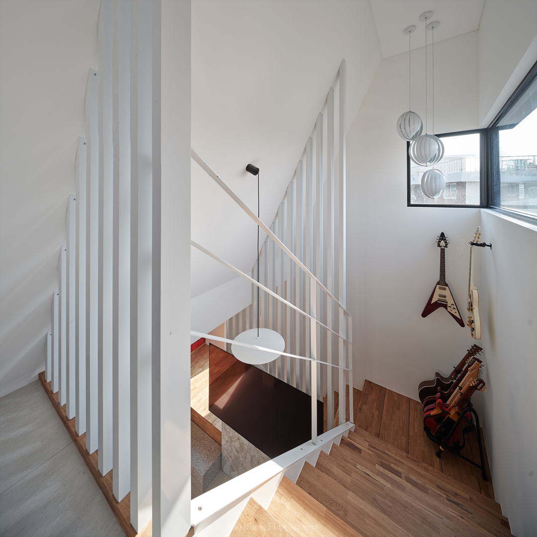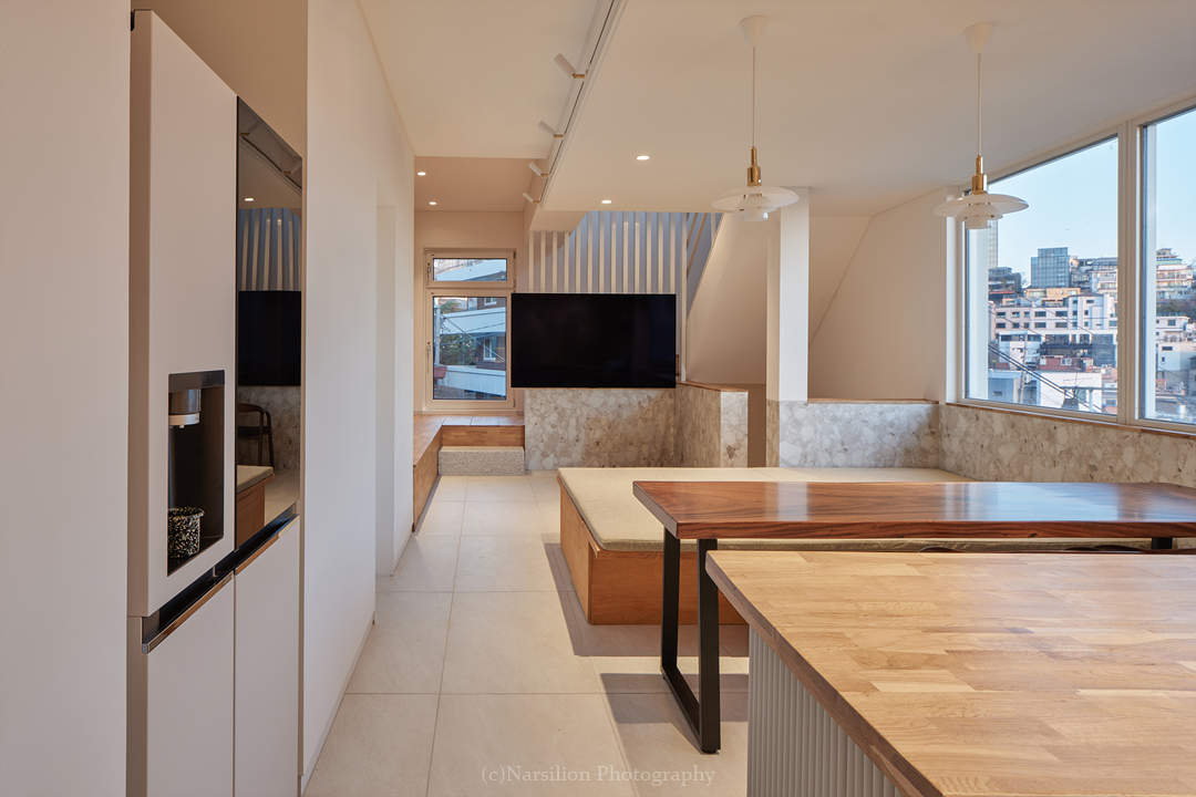 반정주공간을 만든다. 작지만 다양한 활용이 가능하다. 일광욕을 빙자한 멍때리기도 가능하고 잠깐의 핸드폰질도 할 수 있다. 무엇보다 중요한 것은 수직으로 연속된 공간의 피로감을 조금이나마 완화시켜주는 기능을 담는다. 40센티 높이의 스플릿레벨은 벤치와 같은 기능으로 좌식생활에서 일어날 수 있는 생활을 담는다. 책장과 엮어 독서의 기능으로 확대해도 좋다. 무엇보다 줄어든 수직거리만큼 계단이동시 발생하는 피로감을 완화해준다. 사용자에 따라 윈도우시트 또는 리딩누크와 툇마루로 부른다.