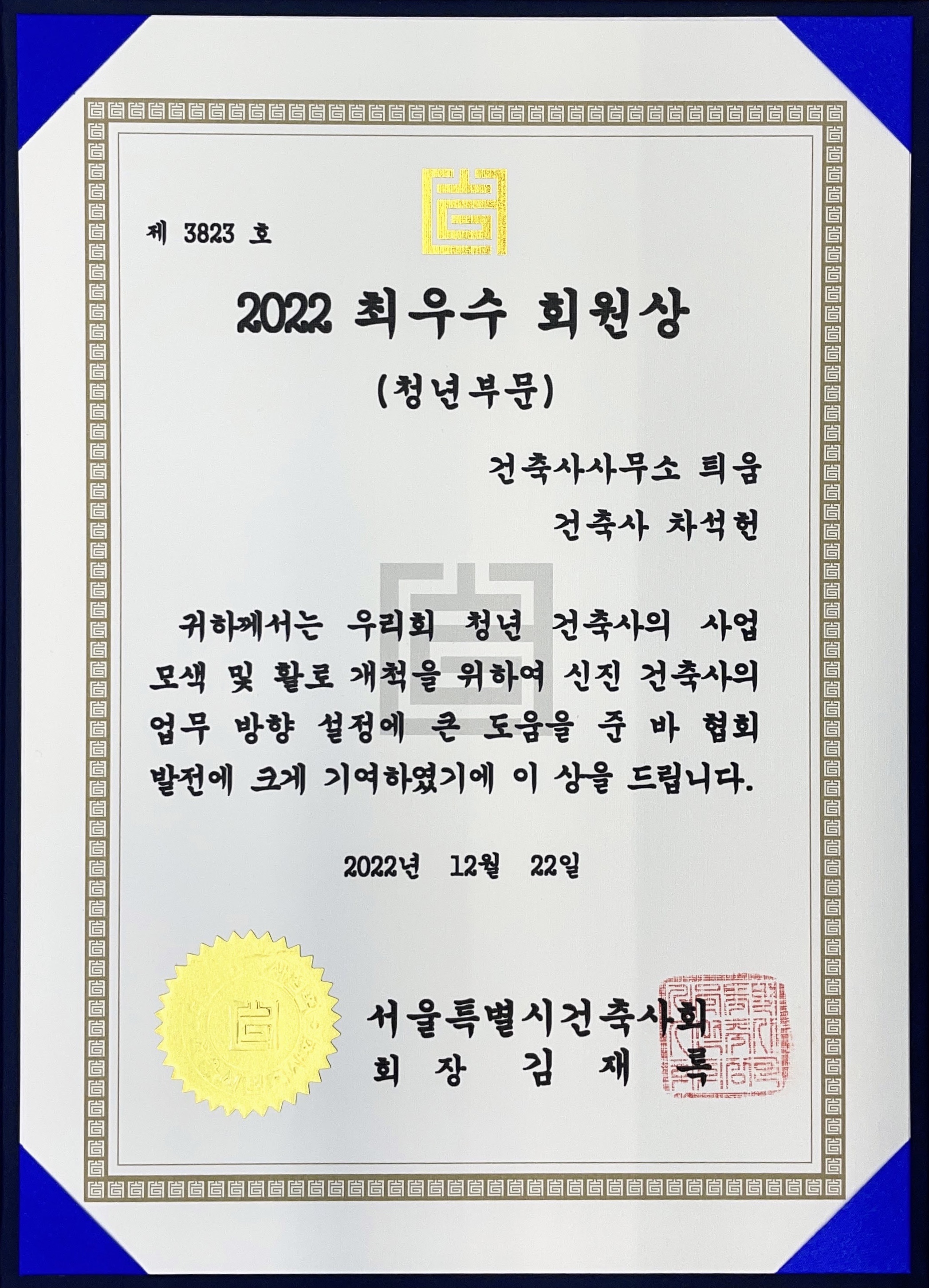 2021, 2022년 서울특별시건축사회 청년위원회 위원으로 참여하였습니다.위원회 일원으로서 노력하였을뿐이네, 큰상을 받게 되었습니다.열심히 활동한 청년위원회를 위한 상이라고 생각하겠습니다.2022.12.22