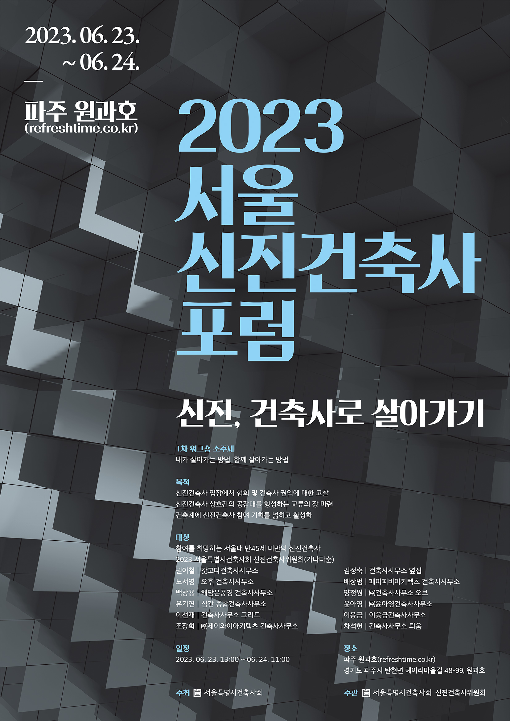 2023 서울 신진건축사 포럼이 오는 6월 23일부터 24일 양일간 파주 원과호에서 진행된다. 서울시등록건축사 중 45세 미만의 신진건축사를 대상으로 하며, 서울특별시건축사회 신진건축사위원회에