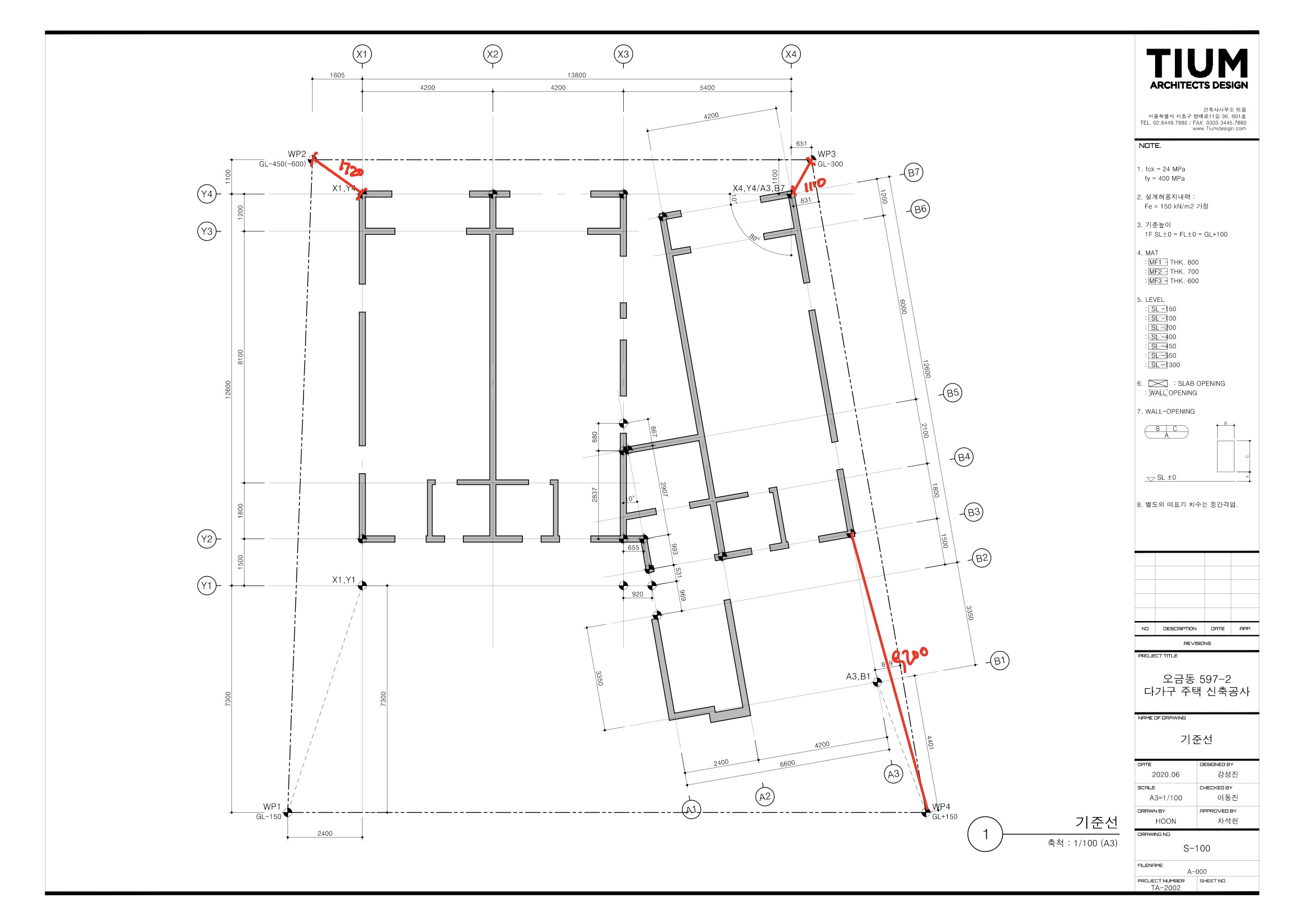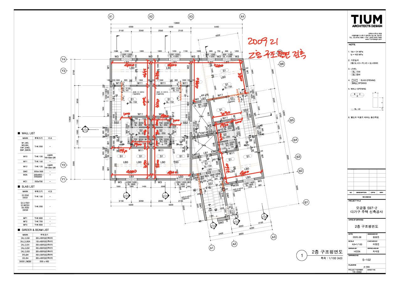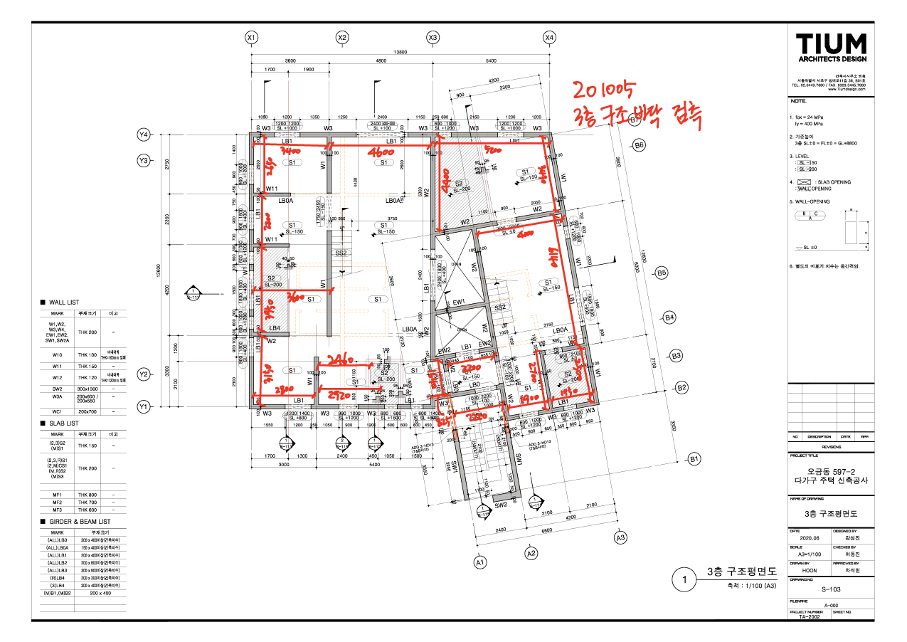콘크리트를 현장에서 타설하는 습식공사에서 설계의 의도를 구현하기 위해서는 시공자뿐만이라 설계자의 관심도 필요합니다. 건물이 각 지점에서 명확하게 위치하는지, 바닥의 레벨은 마감의 두께와 위치를 고려하여 타설되었는지, 공간을 구획하는 동시에 수직하중을 연속시키는 구조벽은 구조도면과 일치한지, 타설된 골조를 검측합니다. 현장에서 타설하는 것을 감안하여, 시공오차 (최종 마감에 따라 구조해석 범위내에서 허용할 수 있습니다.)를 고려합니다.