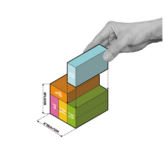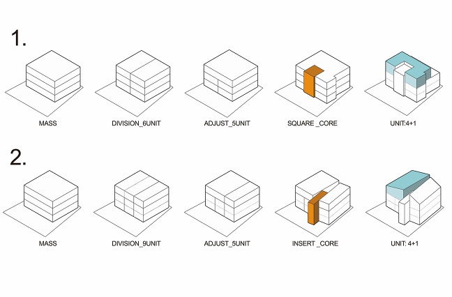 첫번째는 일반적인 주거유닛 배치 입니다. 빌라와 같은 공동주거에서 범용적으로 사용되는 주거배치형식으로 코어를 중심으로 층마다 단층 주거 유닛이 배치됩니다.