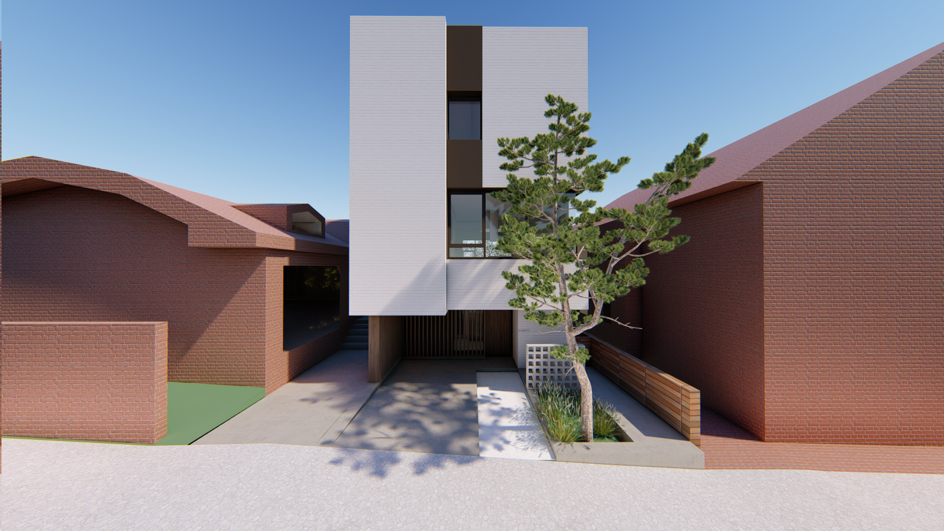 스플릿레벨로 구성된 내부 프로그램과 별개와 외관 디자인은 두가지 방향에서 접근합니다. 도시적 맥락을 연결하는 모던한 주택 이미지와 기존건물 및 이웃한 건물의 박공지붕의 풍경을 연속하는 코지한 주택의 이미지 입니다.