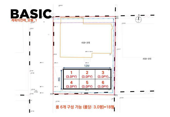 12개의 모듈에서 시작합니다. 그중, 내부공간(건축공간)으로 6개를 사용하고, 6개는 외부공간에 할애합니다. (한 모듈은 3평; 1ROOM을 기준합니다.)